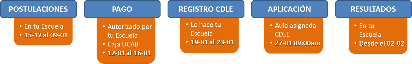 d) Si el estudiante cumple los requisitos para optar por la prueba de suficiencia, la Escuela lo autorizará a realizar el pago en caja UCAB y le indicará las pautas a seguir para reportar este pago a la misma Escuela. - La Escuela, previa verificación, deberá postular ante el Centro de Lenguas Extranjeras (CDLE), en los lapsos de fechas pautados, la lista de estudiantes que pueden presentar la prueba de suficiencia.